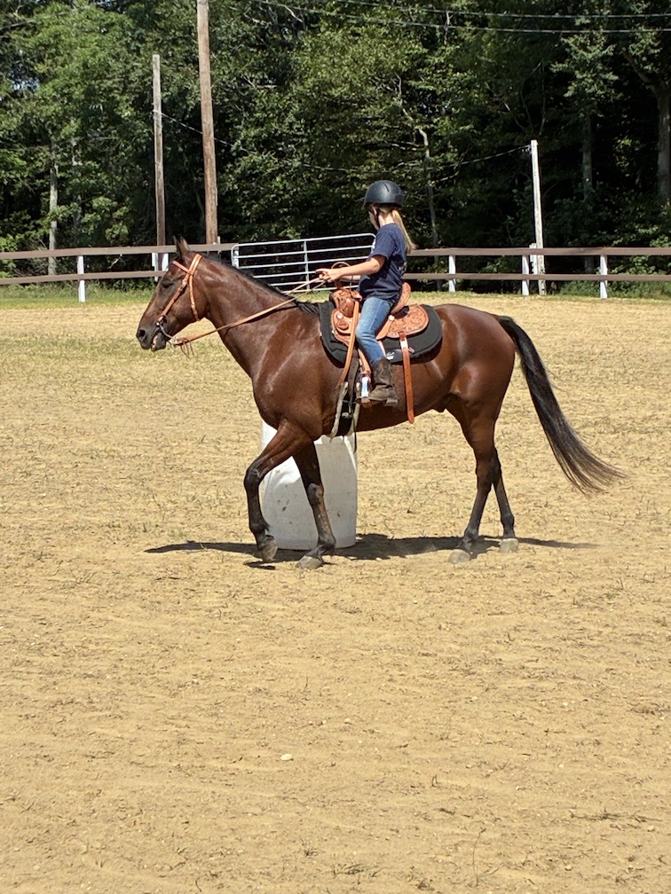 Midcoast Mainers member riding a horse around an obstacle