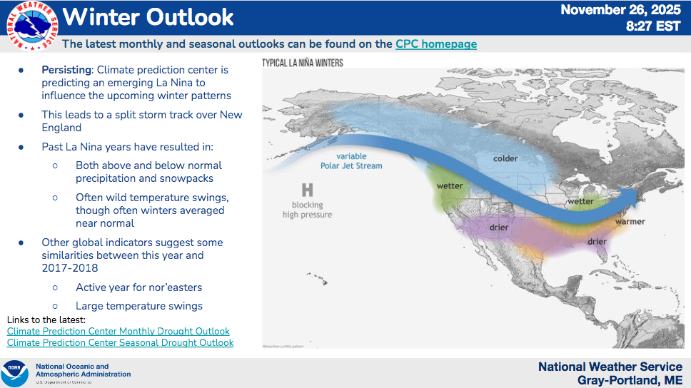 Observational data from Portland, Bangor, and Caribou show that November 2025 monthly mean temperature was near the long-term average at all three sites. Precipitation was below normal at Portland and Bangor (bottom 1/3) and near-normal at Caribou. Hydrologic drought continues across Maine with significant groundwater and streamflow deficits. The U.S. drought monitor classifies most of the state in either moderate (D1; 34% by area) of severe (D2; 63%) drought, but the Midcoast remains in extreme (D3; 3%) drought. There is some potential for improvement if sufficient rainfall develops before the ground freezes in the coming weeks. The amount of snow accumulation this winter and spring snowmelt and groundwater recharge in the spring will determine whether we will see a long-term drought signal. A summary of the latest National Weather Service drought briefing is available on the Maine Climate Office website.